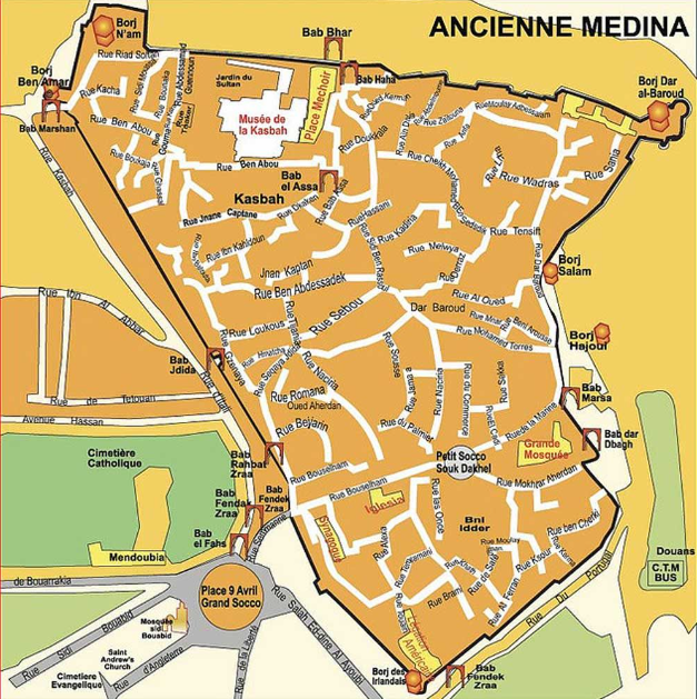 De medina is zonder gids te bezoeken, wel is het handig om iets van een kaart te hebben vanwege alle gangetjes. Verwacht wel aanbod van mannen die zich als gids voor doen en je maar al te graag een rondleiding willen geven of je de weg willen wijzen. Zodra je je auto of taxi verlaat staan ze paraat om je te helpen en ja soms blijven ze je achtervolgen. Mocht je geen hulp willen, zoek dan geen oogcontact en probeer ze te negeren of zeg een vriendelijke ¨No thank you¨. Niet gemakkelijk maar wel het meest effectief. Wil je wel gebruik maken van hun aanbod, spreek dan een vast bedrag af. Ook kunnen winkeleigenaren erg standvastig zijn als het om verkopen gaat, vergeet dus niet te onderhandelen over de prijs. Mocht je echt verdwalen in de medina, loop dan omhoog. Dit is de richting naar de meeste uitgangen of vraag de weg naar ¨Zoco Chico¨ of ¨Bab el-Fahs¨, vanuit dit punt vind je gemakkelijk weer de weg terug of naar een volgende bezienswaardigheid.