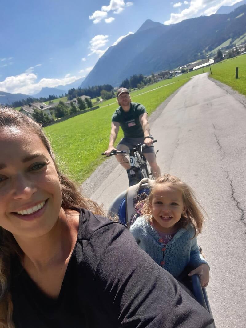 Later de week huurden we E-mountainbikes. Bij aanvang kregen we een kaart, kozen een route en gingen we op pad met onze rugtassen en kids achterop de fiets. Gelukkig hadden we prachtig weer, de fietspaden zijn uitstekend en met de mountainbikes konden we ook de bospaden op en zoefden van de bergen. Af en toe een stop tussendoor voor een boterham en drankje met als uitzicht het prachtige Oostenrijk.